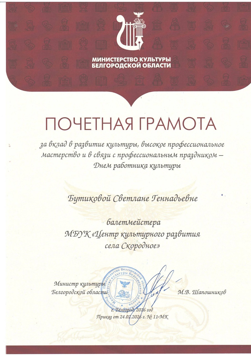 Почётной грамотой Министерства культуры Белгородской области за вклад в развитие культуры, высокое профессиональное мастерство награждена балетмейстер ЦКР с. Скородное - Светлана Бутикова.